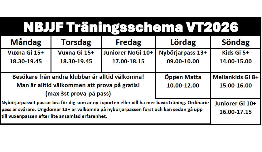 https://www.instagram.com/nynasbjj/Terminsstart 12e Januari enligt nya schemat. Se schema fliken på föregående sida.